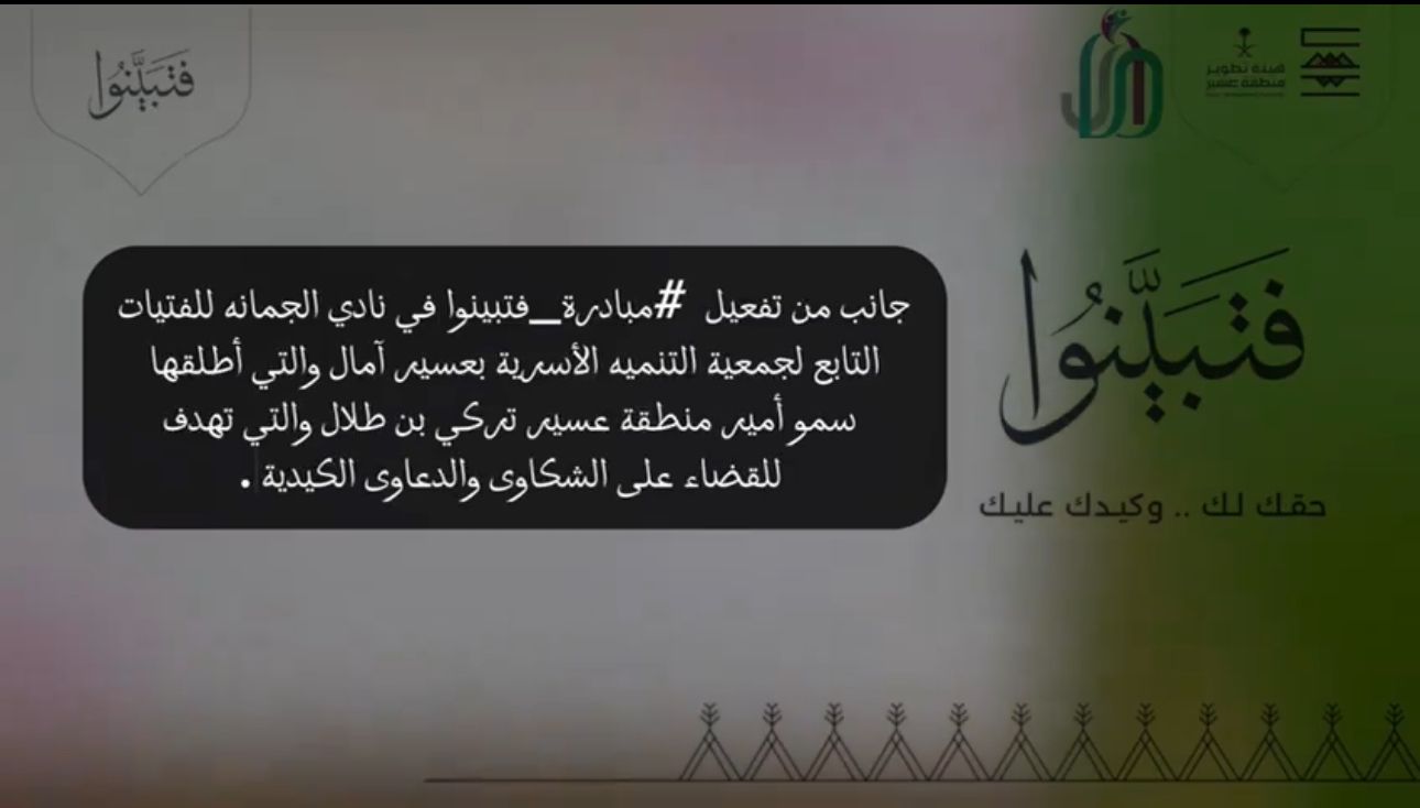 تنفيذاً لتوجيه سمو أمير منطقة عسير والمتضمن إطلاق مبادرة فتبينوا للقضاء على الدعاوى الكيدية، نفّذَ نادي الجمانة التابع لجمعية التنمية الأسرية بعسير آمال المبادرة، صحب ذلك مشاركةُ المستفيدات بالنادي لتوعيتهن عن المبادرة وتعريفهن بها.